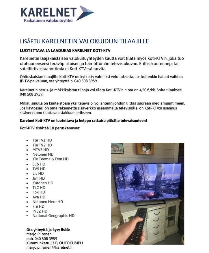 Huomio! Asiakkaiden toivomuksesta olemme saaneet uutena palveluna tarjottavaksi valokuituliittymän tilanneille Karelnet Koti-KTV palvelun.